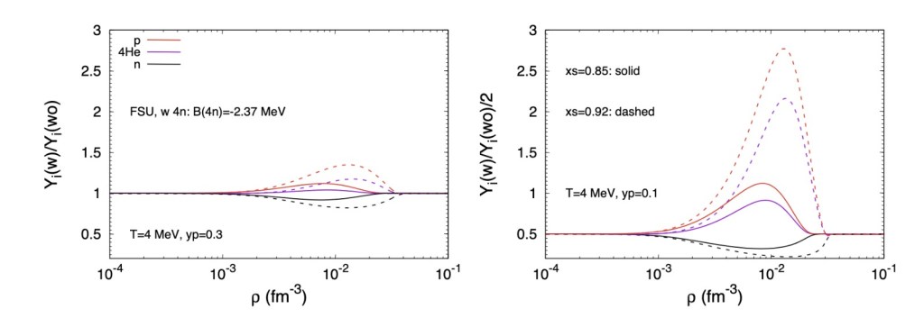 Recently, a resonant state of four neutrons (tetraneutron) with an energy of E_4n=2.37±0.38(stat)±0.44(sys) MeV and a width of Γ=1.75±0.22(stat)±0.30(sys) MeV was reported. In this work, we analyse the effect of including such an exotic state on the yields of other light clusters, that not only form in astrophysical sites, such as core-collapse supernovae and neutron star mergers, but also in heavy-ion collisions. To this aim, we use a relativistic mean-field formalism, where we consider in-medium effects in a two-fold way, via the couplings of the clusters to the mesons, and via a binding energy shift, to compute the low-density equation of state for nuclear matter at finite temperature and fixed proton fraction. We consider five light clusters, deuterons, tritons, heliums, α-particles, and 6He, immersed in a gas of protons and neutrons, and we calculate their abundances and chemical equilibrium constants with and without the tetraneutron. We also analyse how the associated energy of the tetraneutron would influence such results. We find that the low-temperature, neutron-rich systems, are the ones most affected by the presence of the tetraneutron, making neutron stars excellent environments for their formation. Moreover, its presence in strongly asymmetric matter may increase considerably the proton and the α-particle fractions. This may have an influence on the dissolution of the accretion disk of the merger of two neutron stars.